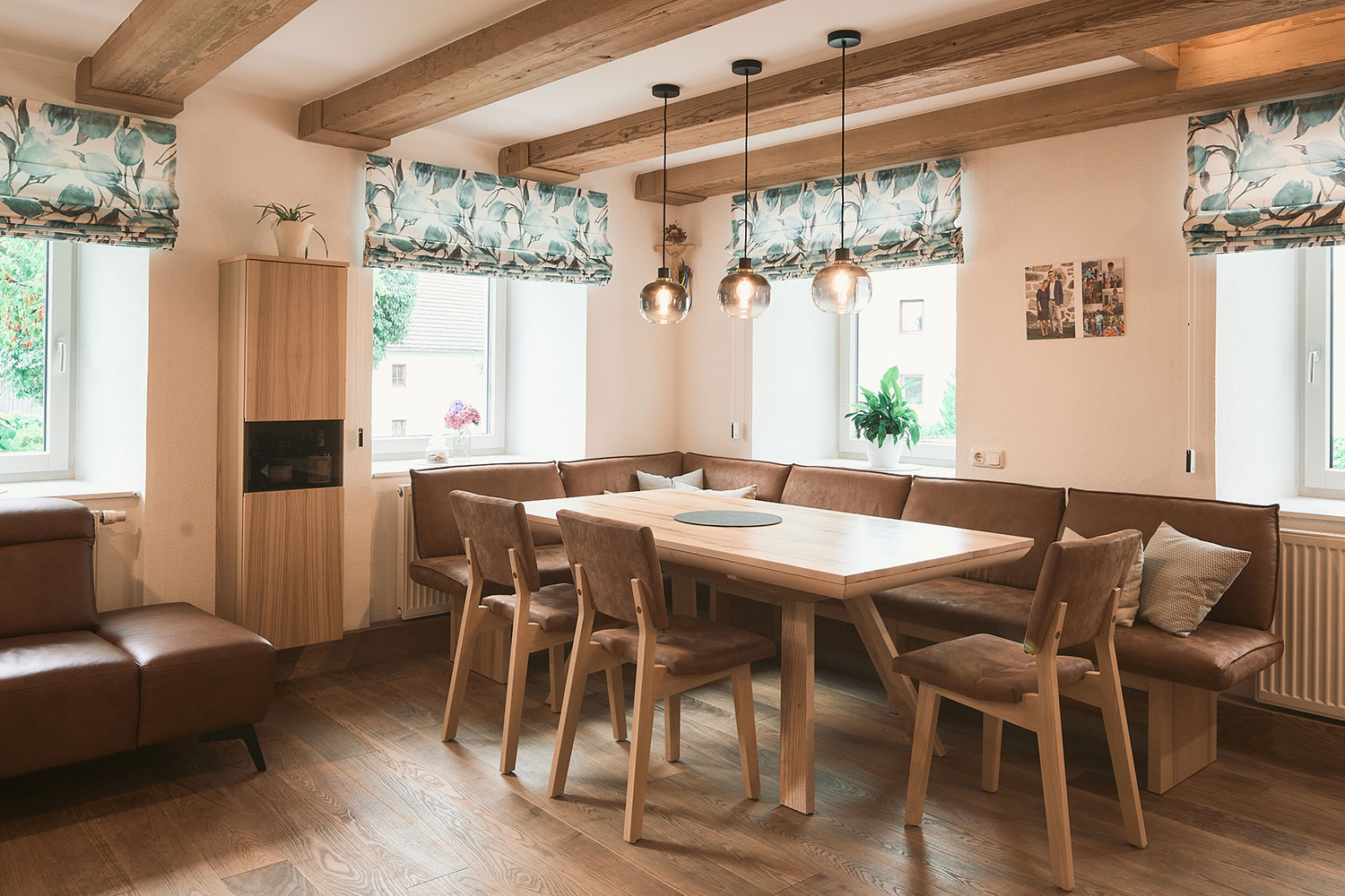 Moderne Möbel aus edler Olivesche treffen auf traditionelle Elemente: Eine gepolsterte Eckbank und die ausziehbare Tischplatte schaffen Raum für gemeinsame Mahlzeiten, lange Gespräche und gesellige Abende. Hier ist Platz für Familie, Freunde und all die kleinen Momente, die das Leben besonders machen. (Fotos: Robert Maybach)