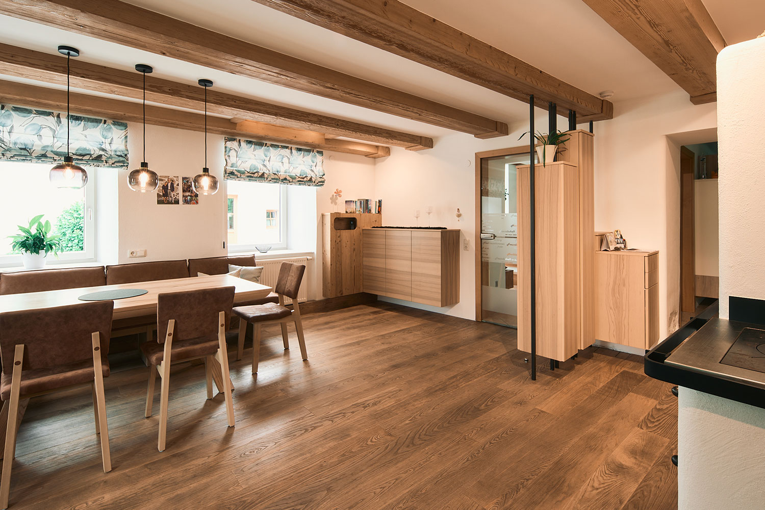 Freigelegte Deckenbalken, liebevoll mit Altholz verkleidet, erzählen von der Vergangenheit – während der neue Kachelofen mit Tischherd behagliche Wärme spendet und der Stube einen rustikalen, gemütlichen Touch verleiht.