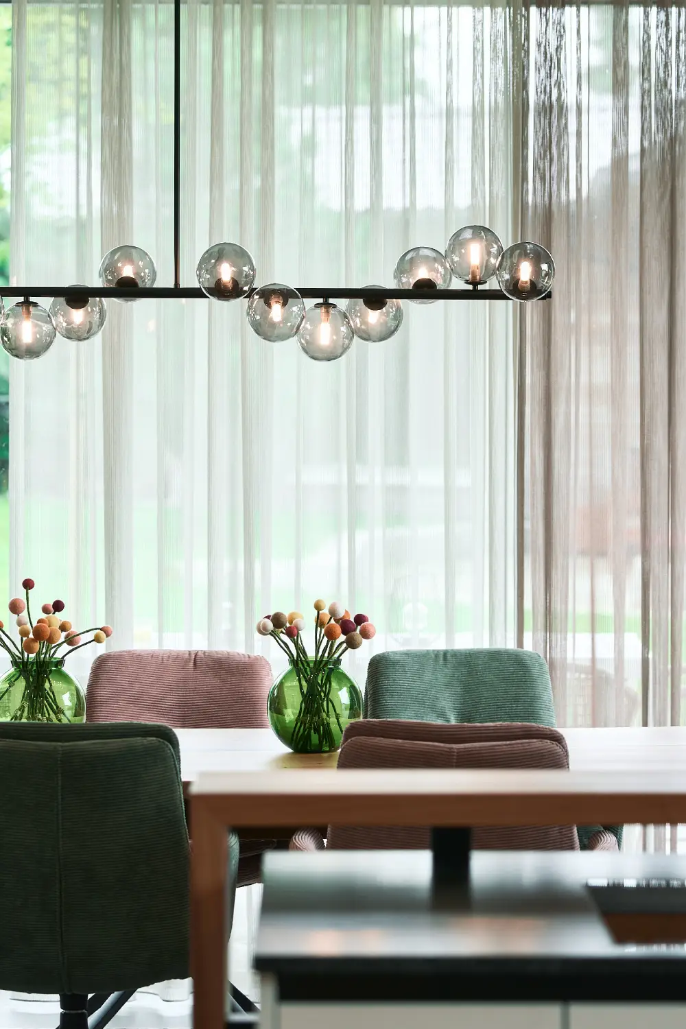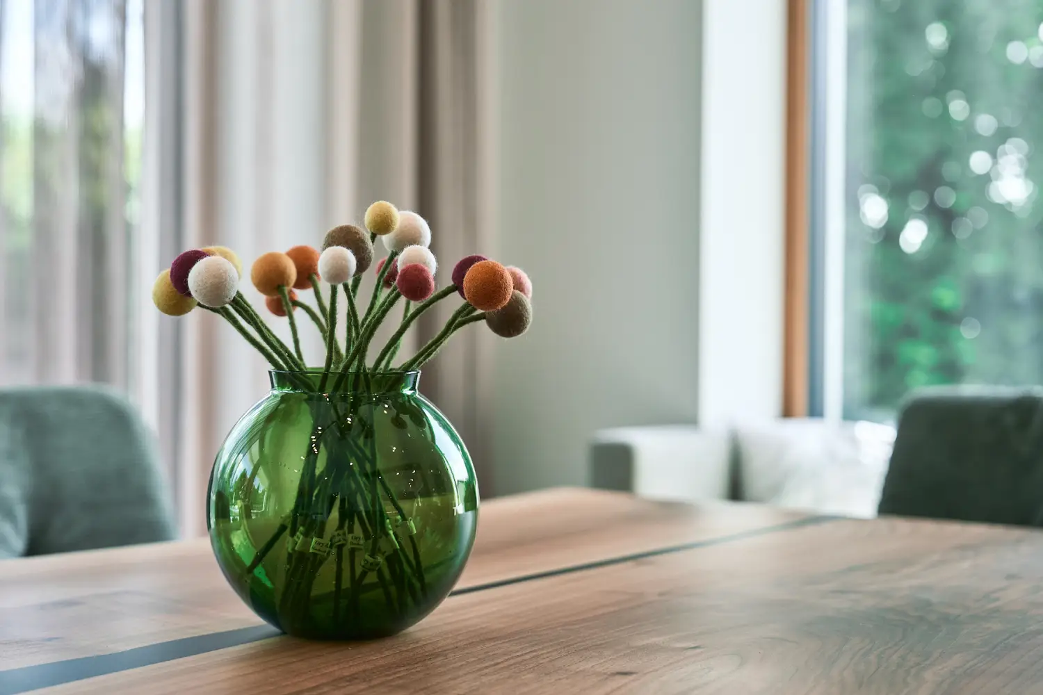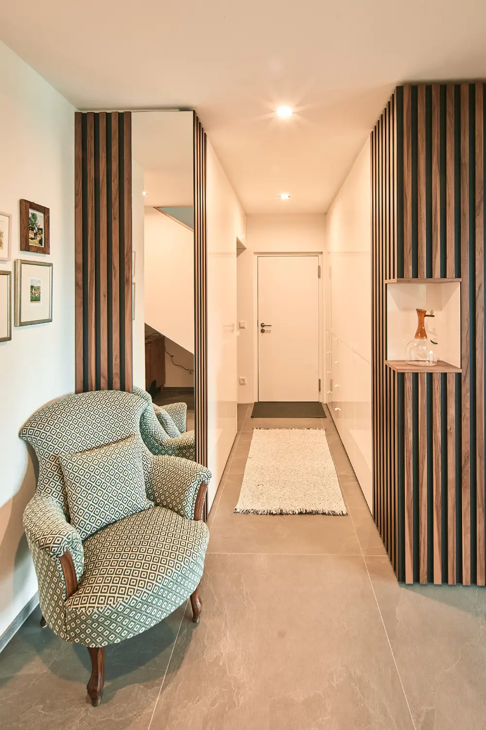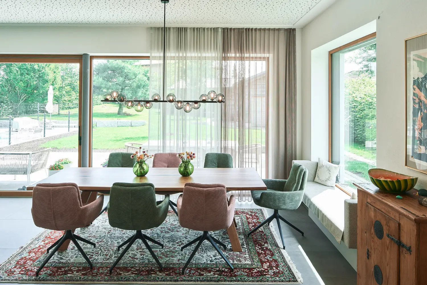 Die Einrichtung dieses Reihenhauses in Linz mit eigenem Gemüsegarten, spiegelt die Lebhaftigkeit der jungen Familie in vollen Zügen. Die Küche punktete mit einer Arbeitsfläche aus Keramik mit natürlicher Struktur. Fließend ist der Übergang zum Esszimmer. Die Stühle und der Tisch stammen aus unserer HOCKN-Serie mit hochwertigem Lodenbezug. Die intelligente Lichtlösung im Wohnzimmer rückt die großzügige Wohnlandschaft ins perfekte Licht. Die Garderobe versprüht unter anderem durch ihre robusten, mehrfärbigen Glaseinsätze besonderen Charme. (Fotos: Kurt Hörbst)