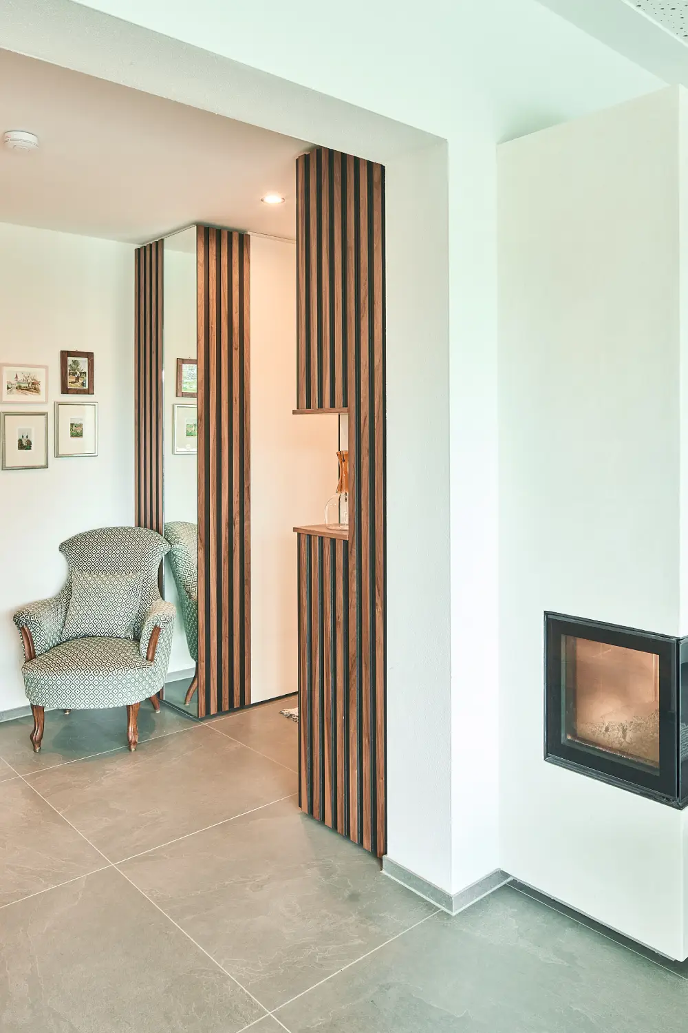 Weniger ist mehr! Die Familie bevorzugt einen minimalistischen Einrichtungsstil. Minimalismus ist die Kunst des Weglassens und befreit unsere Wohnung von Überflüssigem. Nur wenige Elemente werden mit Bedacht und Sorgfalt ausgesucht. Die Wandgestaltung aus Massivholz erfüllt die Sehnsucht nach visueller und haptischer Natürlichkeit und bildet eine Harmonie zum Modernen. (Foto: Julia Wahl)